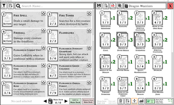 The simplified visualization of the cards in the center also seem to have some visual issues, at least on my screen, causing them to be compressed much more than they need to, scrambling the fine lines of the artwork into being unrecognizable. It'd also be nice if you could add cards to a deck with a right-click instead of having to mouse to the bottom-left after selecting a card.