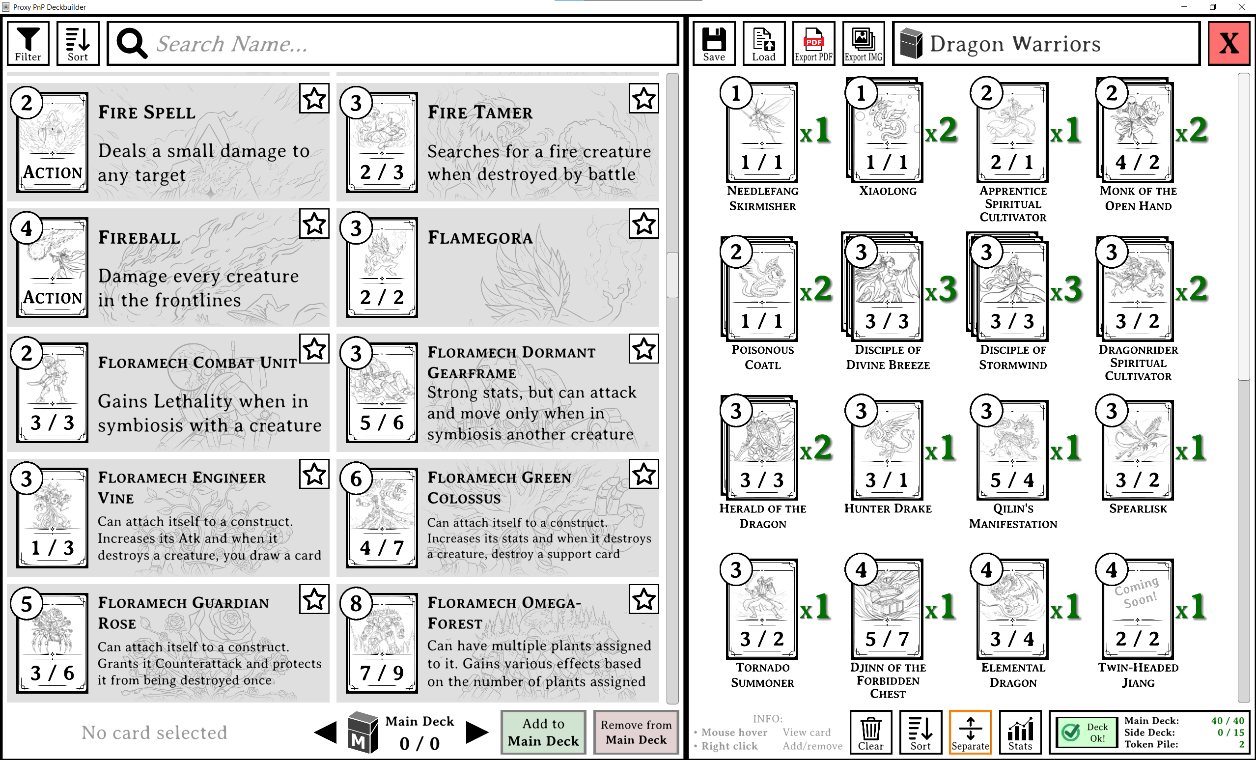 This editor allows you to easily list cards, browse them and build your decklist. It also allows you to automatically create a PDF file ready for printing so that you can create your physical deck immediately. You can also export cards as png images in case you want to customize them.